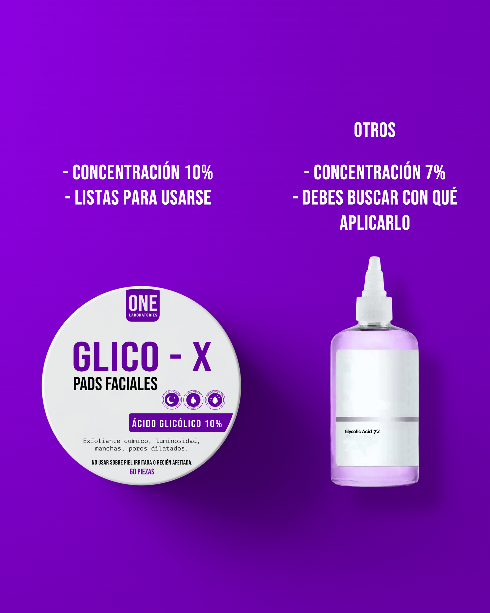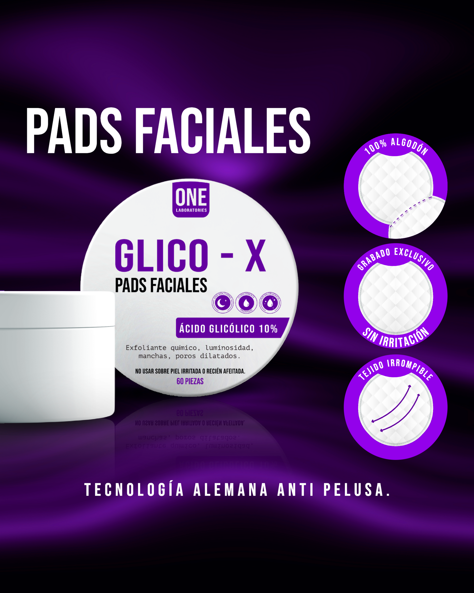 Pads faciales con solución base acuosa 10% de ácido glicólico. El ácido glicólico es un AHA (alfahidroxiácido) que ayuda a exfoliar la capa más superficial de la piel para mejorar su textura y potenciar un aspecto más luminoso.